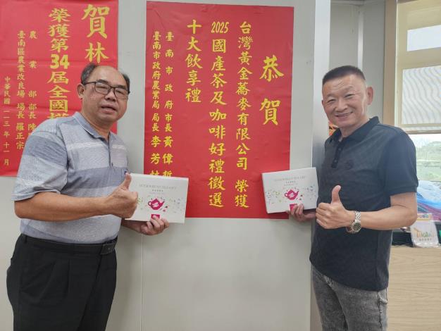 臺南市長黃偉哲祝賀肯定這兩間臺南優質廠商,台灣黃金蕎麥有限公司與大鋤花間咖啡生態農場在產品創新與品質堅持上的努力,並指出:「這些融合在地風味與文化的創意商品,正是推動台灣茶與咖啡產業升級的重要力量。」。