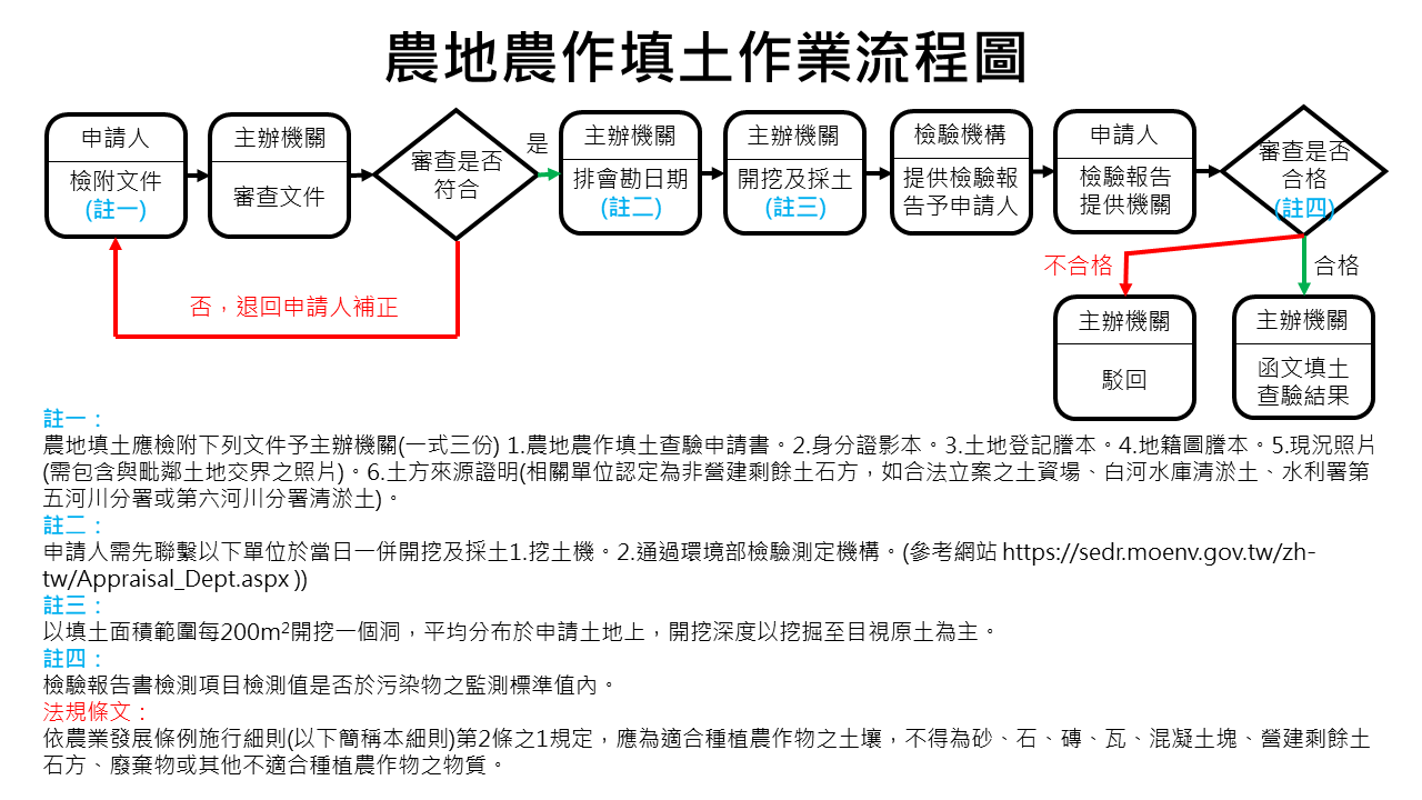 農地管理農地農作填土相關資料 農地農作填土作業流程圖 填土需求申請容許使用案件容許申辦流程 1.農地農作填土查驗Q&A 2.農地農作填土查驗申請書(word、odf、PDF) 3.土壤汙染管制標準 4.認證合格土壤檢驗機構(參考) 環境部檢驗測定機構參考網站( https://sedr.moenv.gov.tw/zh-tw/Appraisal_Dept.aspx ) 5.農地填土申請應檢附下列文件:(一式三份)(1)農地農作填土查驗申請書(2)身分證影本(3)土地登記謄本(4)地籍圖謄本(5)現況照片(需包含與毗鄰土地交界之照片)(6)土方來源證明